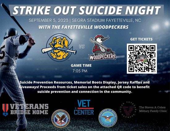 On September 5, 2023, the Fayetteville Woodpeckers are taking on the Charleston Riverdogs at Fayetteville Ballpark and it’s Strike Out Suicide Night. There will be suicide prevention resources, memorial boots ...