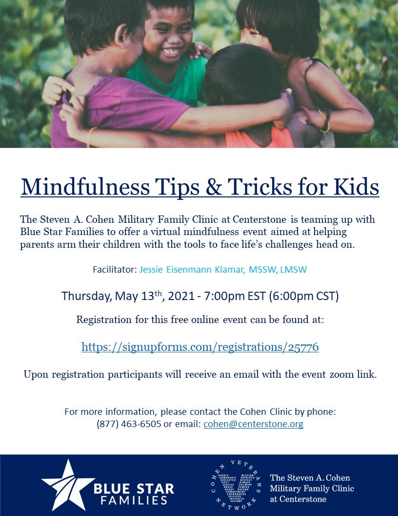 The Steven A. Cohen Military Family Clinic is teaming up with Blue Star Families to offer a virtual mindfulness event aimed at giving kids the tools to face life’s challenges head on.
